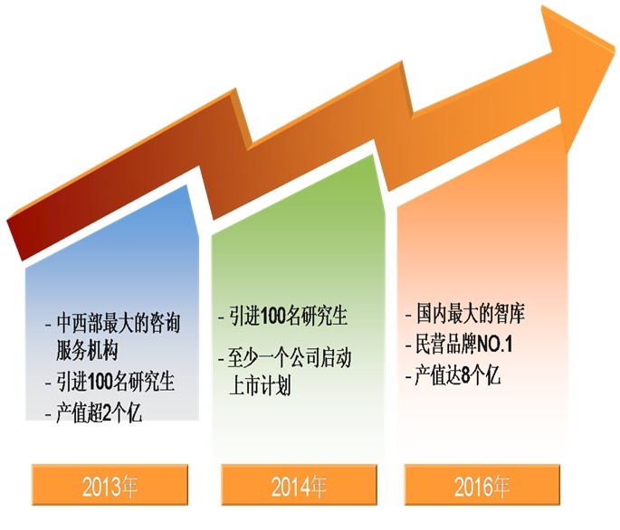 本公司是以人才為依托,以市場為導(dǎo)向,致力于打造中國第一流的技術(shù)咨詢團(tuán)隊。目前已形成員工500余人、產(chǎn)值近2億元、服務(wù)資質(zhì)18個、業(yè)務(wù)范圍11個省的初步規(guī)模,但技術(shù)力量還比較薄弱,服務(wù)范圍還不理想,公司的影響力比較有限。在公司擬在成立十周年之際,緊抓十八屆三中全會所帶來的歷史機(jī)遇,苦練內(nèi)功,改革創(chuàng)新,挖掘潛力,用3-5年時間,使公司員工達(dá)到1500人、產(chǎn)值達(dá)到8-10億元、努力成為中國最有影響的技術(shù)咨詢單位之一。5-10年以后,眾望咨詢業(yè)務(wù)將覆蓋全國并走向世界,打造1-2個上市公司,業(yè)務(wù)范疇將向技術(shù)研究、創(chuàng)造發(fā)明、企業(yè)設(shè)計、戰(zhàn)略開發(fā)、組織結(jié)構(gòu)、經(jīng)營運作等方面拓展,成為中國的“麥肯錫”……